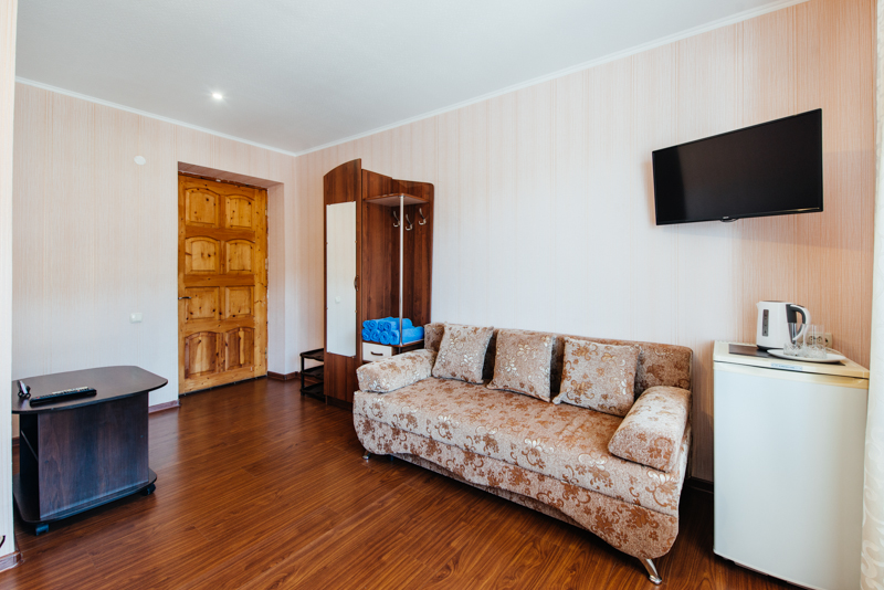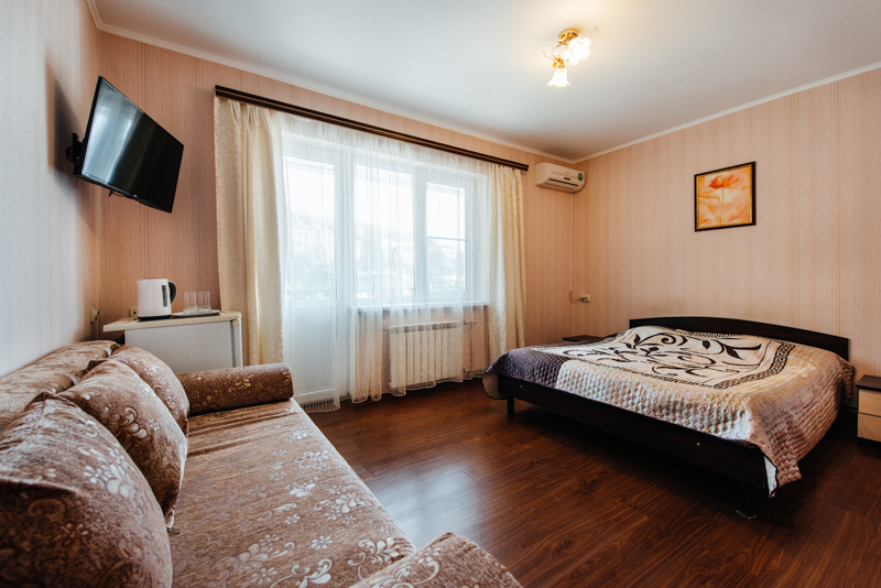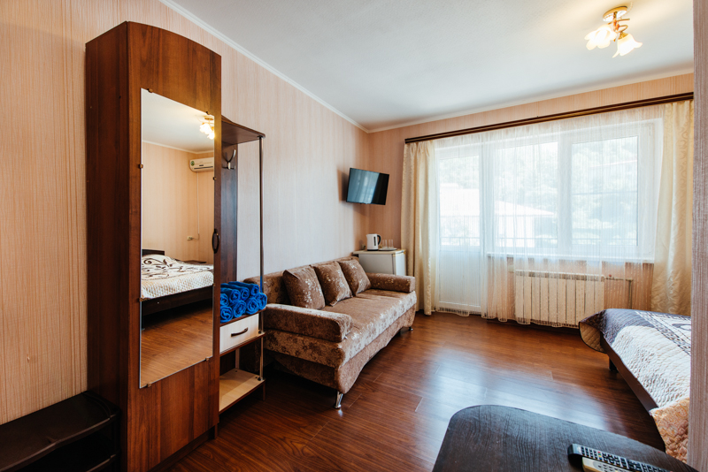 Удобства: кондиционер, холодильник, зеркало, диван-кровать, двуспальная кровать, душ, wi-fi, телевизор, шкаф, тумбочка, кровати, умывальник, туалет.